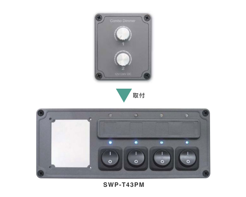 ▷一つのパネルに最大許容60Wの調光回路が2組ついています。 ▷LEDライト、電球とハロゲンランプの調光が可能です。 ▷回転つまみの短押しでライトの点灯と消灯(ON/OFF)が切り替えられます。 ▷回転つまみのダイヤルによりフルスケール(0%~100%)で明るさが256段階に調整できます。 ▷明るさを1~100%に調整し、短押しでOFFに切替えてから、再度ONに切替えると、前回の明るさで光ります。 ▷明るさをOFF(0%)に調整し、短押しでOFFに切替えてから、再度ONに切替えると、最大の明るさで光ります。 ▷ダブルギボシ採用のため、接続作業が便利です。 ▷オプションの4連スイッチパネル(SWP-T43PM)と組み合わせることで、集中的に電装品を制御できます。 |