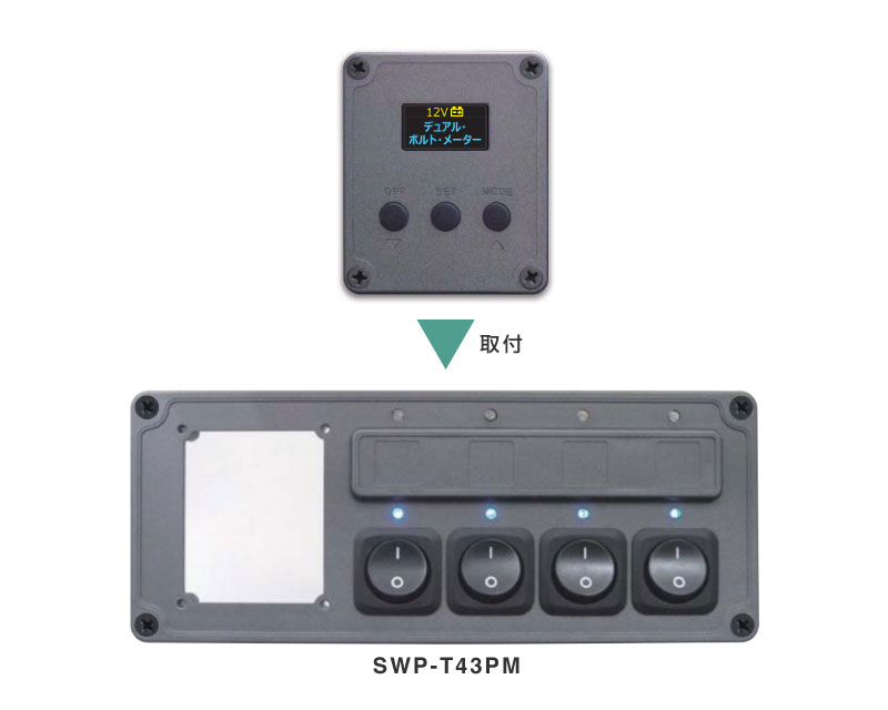 パネル式(穴開けて埋め込む);穴あけ幅42✕高49mm;取り付け後、パネル部の厚み2.0mm。 オプションの4連スイッチパネル(SWP-T43PM)と組み合わせることで、すべての電装品が集中的に制御できます。 |